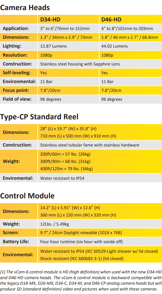 Increase productivity and profitability with the feature-rich vCam-6 inspection camera system. Built tough and reliable for everyday use, the versatile vCam-6 is a good fit for plumbers, contractors, home inspectors, building maintenance supervisors, or anyone looking to inspect the interior of a pipe or duct. Create crisp, detailed HD video inspections with audio comments, text descriptions, footage, date, and timestamps to submit to your customers without worry. Putting in a full day's work is easy with the four-hour battery life and charging on-the-go with the provided AC and DC charging leads.