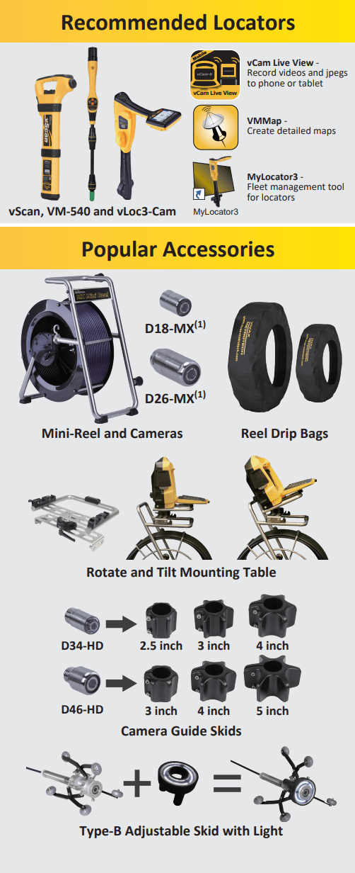 Designed for ease of use and engineered for dependability, vCam inspection products ensure trouble-free operation with little down time. Extend the capabilities of the system with the smaller accessory Type-MX reel for smaller lines, or increase the inspection diameter with the optional adjustable Type-B skid.